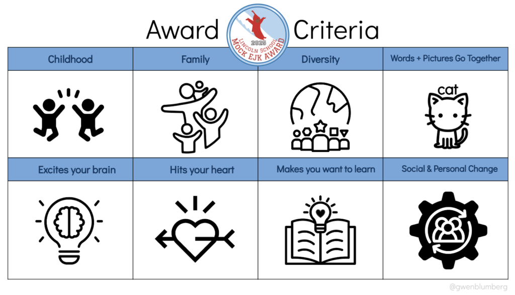 Rather than having kids vote for their preferred choice based solely on likeability, I wanted them to think deeply about how the books met or didn’t meet a set of stated criteria. Using guidelines provided by the EJK Foundation that were solid but very text-heavy, I set out to create a visual representation. Using graphics from The Noun Project, I selected one icon for each criterion. I then thought about brief, kid-friendly language that could be used in the form of questions throughout the book award unit to guide the students through the criteria and make it user-friendly for K–4 students.