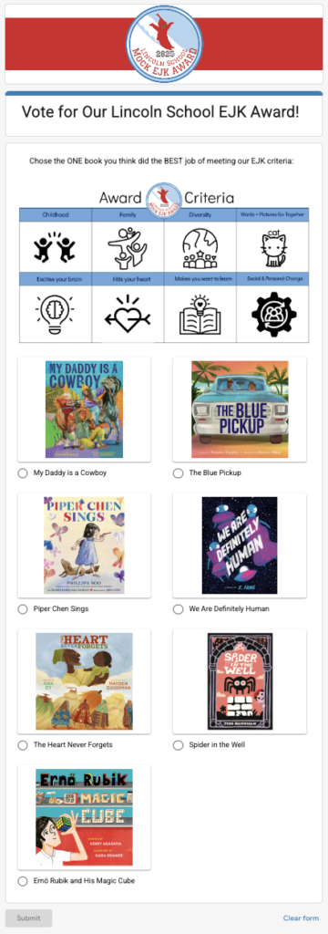 As we worked through the weeks, the kids became more and more eager to vote. I contemplated the simplest way for children to cast their votes and for me to tabulate them. I decided that a Google Form would be the easiest way to do this and imported the covers of the books as clickable options to make it visually appealing and easy to access for all learners.