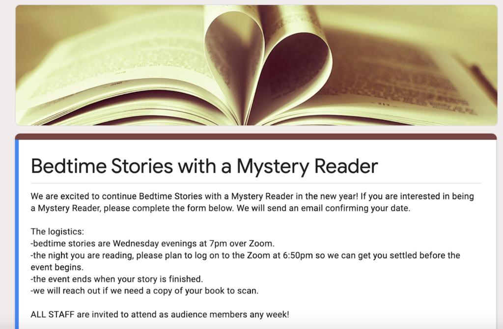We sent out a Google Form to all staff members for them to indicate interest in being a Mystery Reader. The form included general information at the top, pictured below.