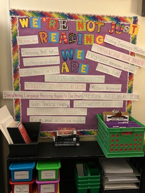 After this reflection, I got out some sentence strips and had students add their favorite “reading reason” to a bulletin board at the front of the classroom that proclaimed “We’re not just reading. We are…” I kept the bulletin board up all year long, so my students, my administrators, and I wouldn’t fall victim to thinking that we were ever just reading.