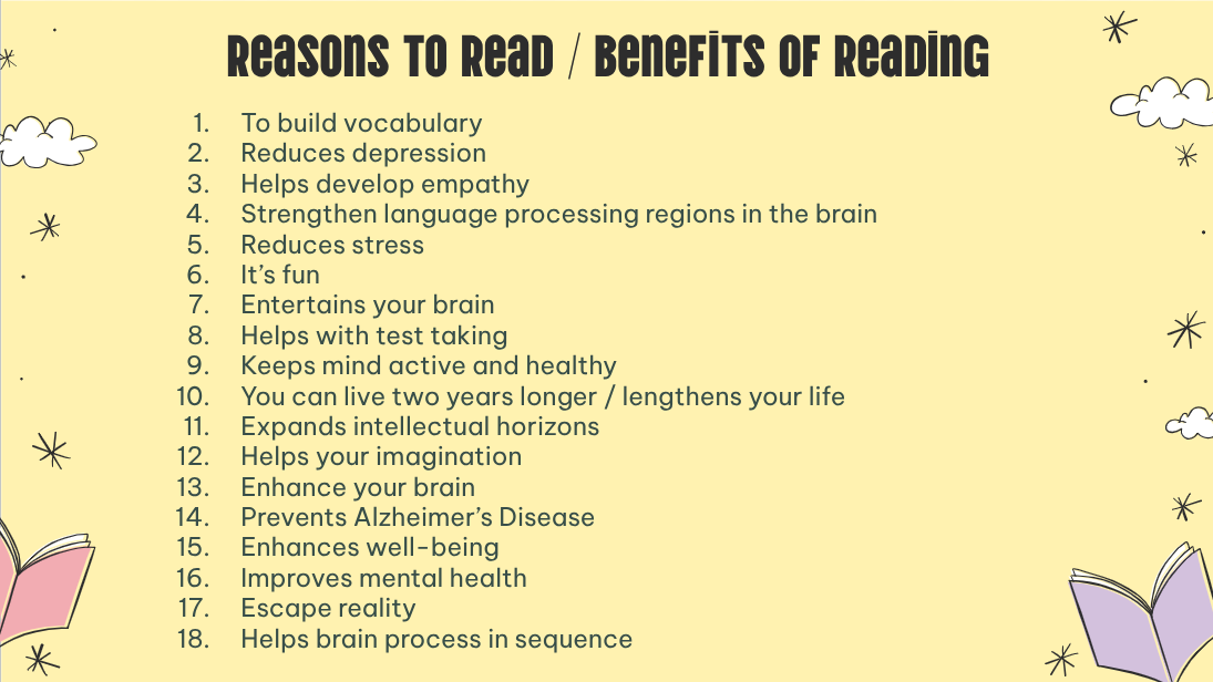 After they made their lists, I had them make their way around the room, sharing with their peers, and seeing how many more items they could add. Next, I gathered several articles that discussed different benefits of reading that students used to add to their growing lists. Here is our master class list: